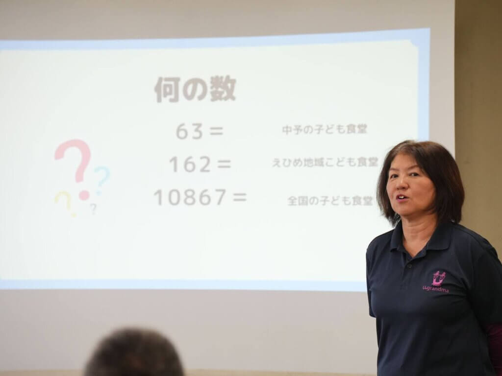 ワークショップでは、「うわじまグランマ」代表理事の松島さんから、愛媛県内の子ども食堂の現状についてお話がありました。