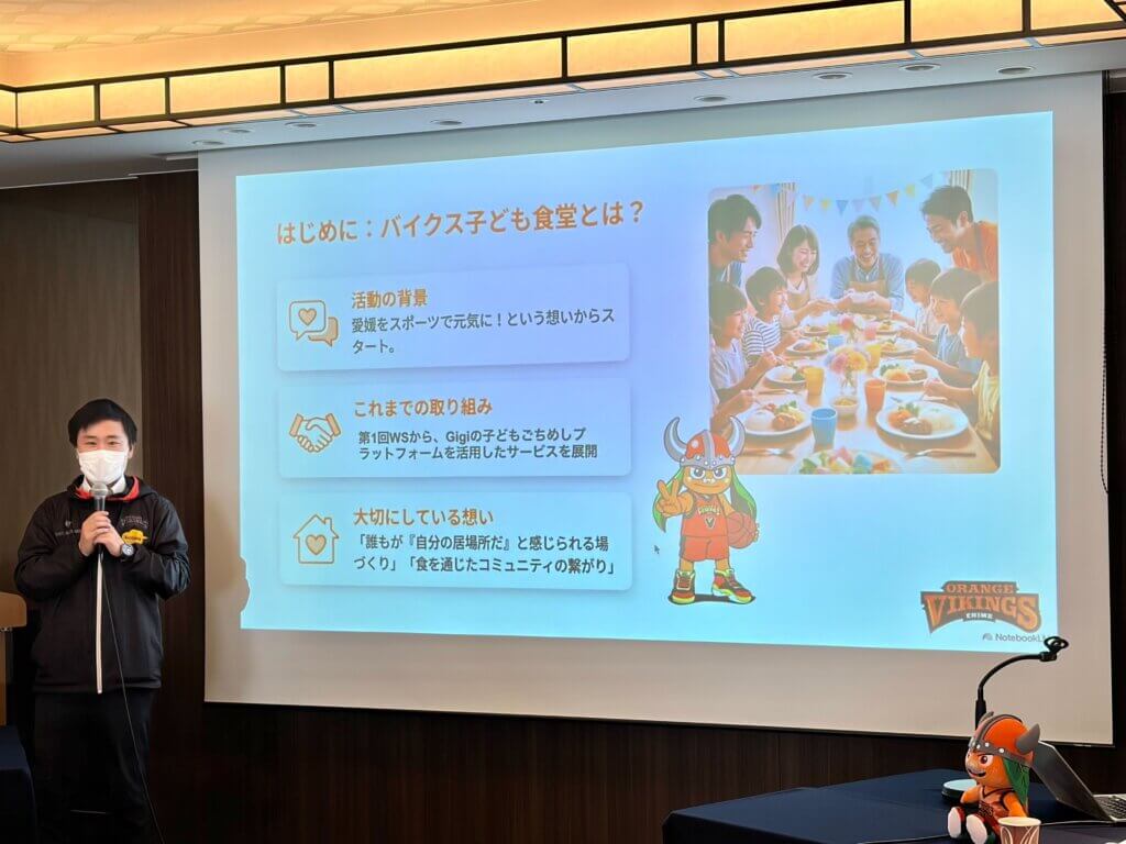 はじめに、愛媛オレンジバイキングスの山本さんより、これまでのワークショップの振り返りと、「バイクス子ども食堂」に込めた想いが語られました。