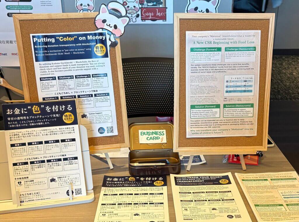 ブースでは、「ブロックチェーン技術による寄附金の透明化」と「フードロス削減」という2つのテーマで展示を行いました。